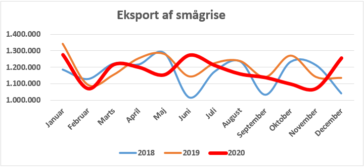 En meget stor del af forklaringen på de flere tilførte grise ligger i smågrise der ikke blev eksporteret i efteråret 2020. I nedenstående graf kan man se det store fald i eksporten i efteråret 2020 sammenlignet med tidligere år. Det er bl.a. disse grise vi kæmper med at få slagtet nu.