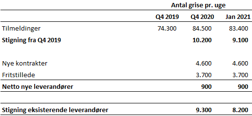 Vi har siden 4. kvartal 2019 i alt fået øget tilførslerne af grise med ca. 14.800 grise pr. uge i løbet af 2020, specielt i 4. kvartal. Dette svarer til en stigning på næsten 20%. Af disse grise er 4.600 grise / uge fra nye leverandører der blev tegnet kontrakt med i 2019 og tidligere. I sommeren 2020 har vi, som følge af vores slagtepukkel mv., fritstillet leverancer af ca. 3.700 grise pr uge så de kunne levere til anden side. Dermed har de leverandører der leverede til os ultimo 2019 netto øget deres leverancer med ca. 9.300 grise pr uge, hvilket er mere end 12% stigning.